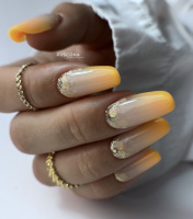 Tragen Sie den Glitzer von der Nagelspitze zur Nagelwurzel auf und verblenden Sie ihn nach und nach, bis er allmählich verschwindet. Versiegeln Sie das Ganze mit einem Top-Coat.