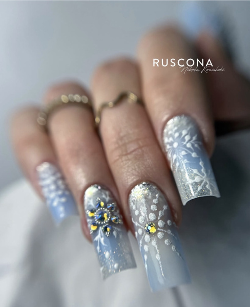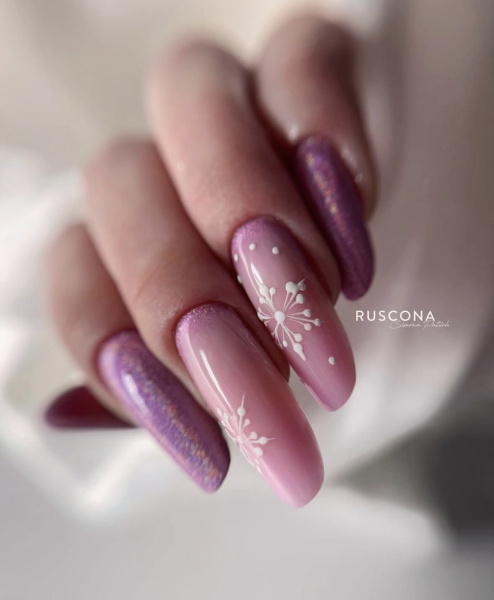 Moderne Winterdekorationen sind minimalistisch. Beliebt sind Mikro-Schneeflocken, feine Linien, Sugar-Effekte, Ice-Chrome-Details, Perlen oder Kombinationen aus matten und glänzenden Oberflächen. Weniger ist im Winter 2026 mehr.